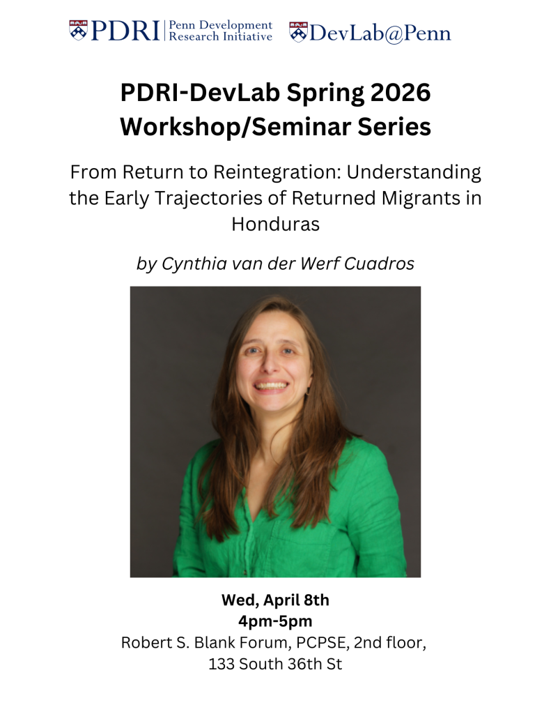 Wednesday, April 8th will be the next session of our Spring 2026 Workshop/Seminar series. Please join us at 4pm in the PCPSE Forum for Cynthia Van Der Werf Cuadros’s workshop: “From Return to Reintegration: Understanding the Early Trajectories of Returned Migrants in Honduras.”