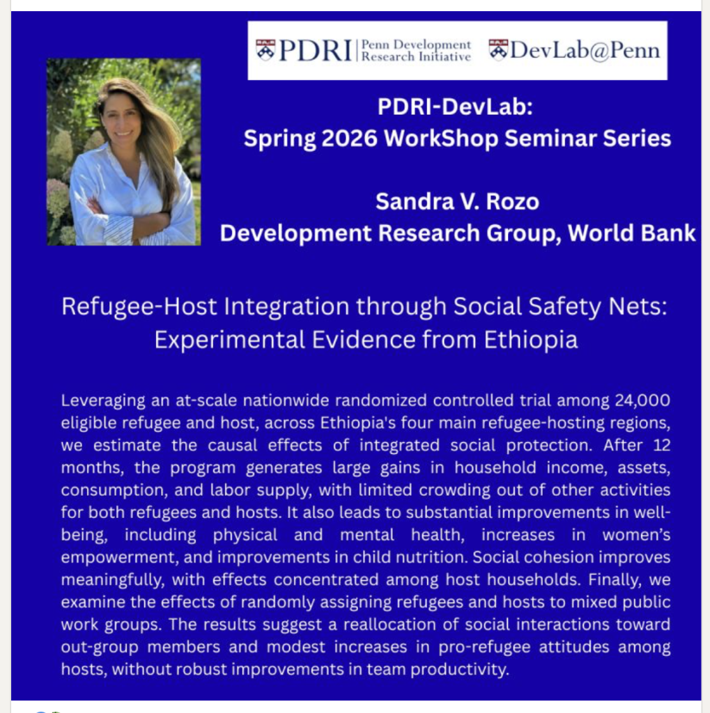 Wednesday, February 25th will be the next session of our Spring 2026 Workshop/Seminar series. Please join us at 4pm in the Forum for Sandra Rozo’s seminar: “Refugee-Host Integration through Social Safety Nets: