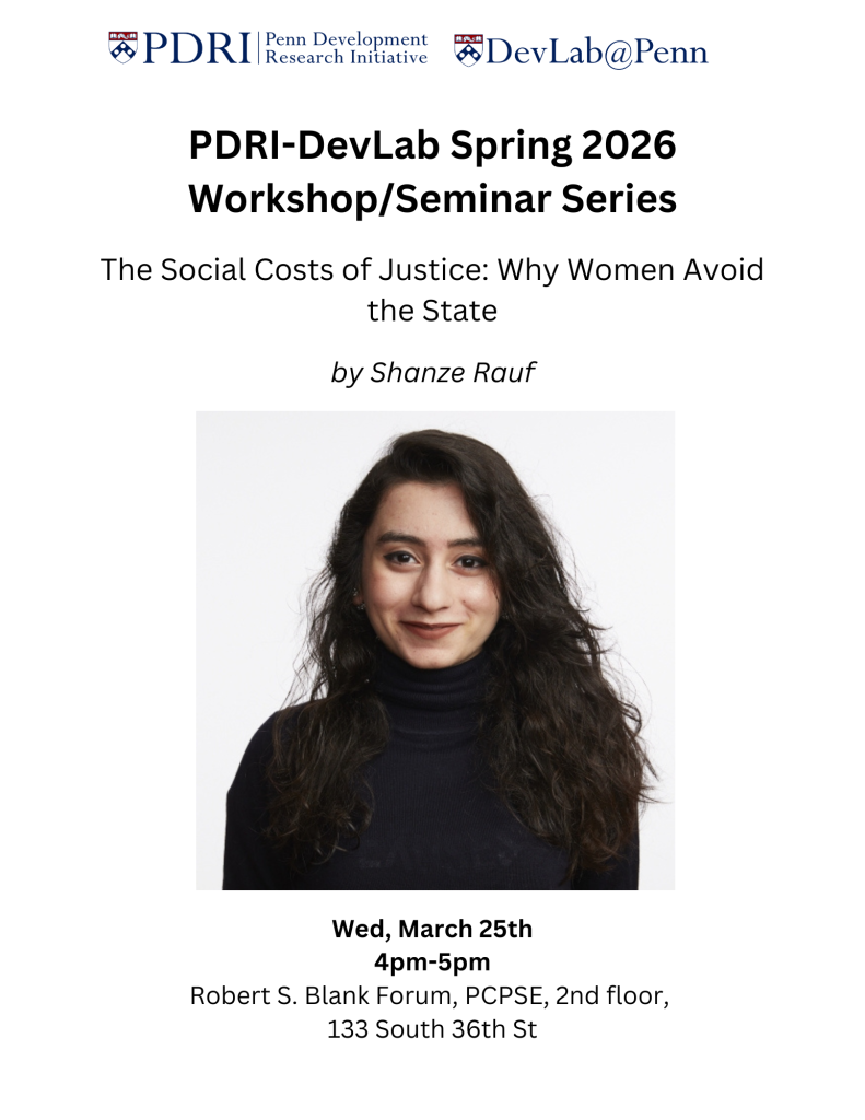 Wednesday, March 25th will be the next session of our Spring 2026 Workshop/Seminar series. Please note that this session will be held in PCPSE 625, NOT the Forum. Please join us at 4pm in PCPSE 625 for Shanze Rauf’s workshop: “The Social Costs of Justice: Why Women Avoid the State.” Please reach out to sandrafa@sas.upenn.edu for the research design document. Please take some time to review the design document before the Workshop on Wednesday.